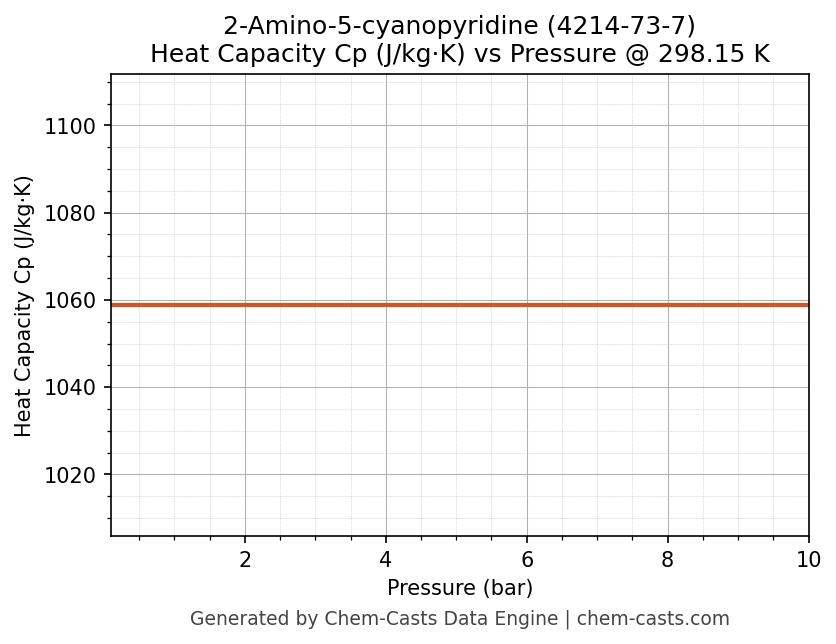 This page presents the pressure-dependent thermodynamic and transport properties of 2-Amino-5-cyanopyridine (CAS 4214-73-7) calculated at a constant temperature of 298 K (25 °C) over the pressure range 0.10-10 bar.