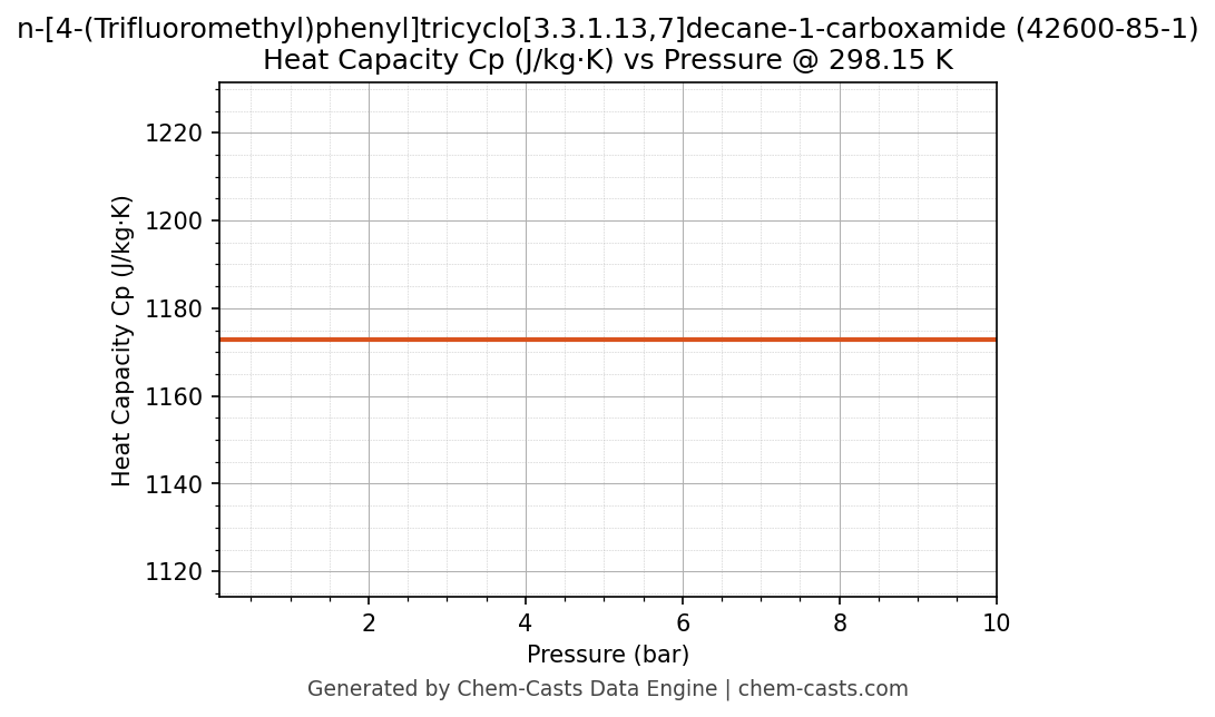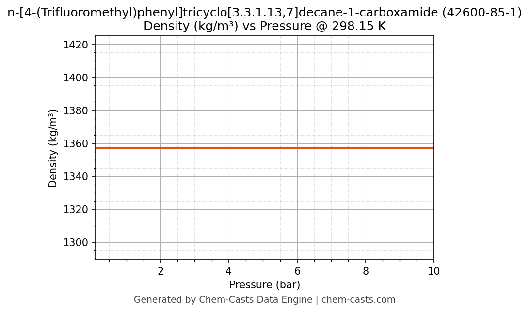 This page presents the pressure-dependent thermodynamic and transport properties of n-[4-(Trifluoromethyl)phenyl]tricyclo[3.3.1.13,7]decane-1-carboxamide (CAS 42600-85-1) calculated at a constant temperature of 298 K (25 °C) over the pressure range 0.10-10 bar.