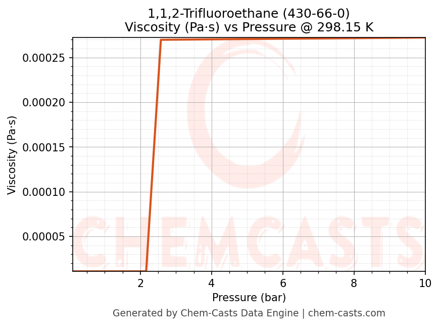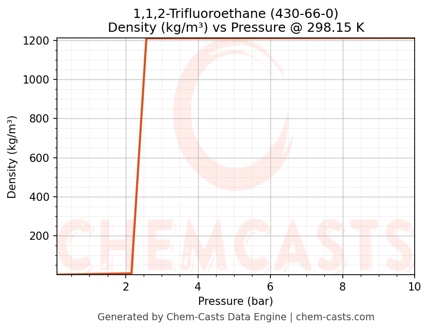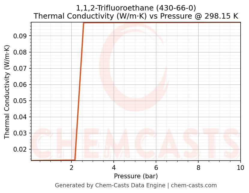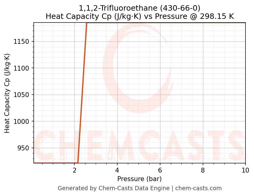 This page presents the pressure-dependent thermodynamic and transport properties of 1,1,2-Trifluoroethane (CAS 430-66-0) calculated at a constant temperature of 298 K (25 °C) over the pressure range 0.10-10 bar.
