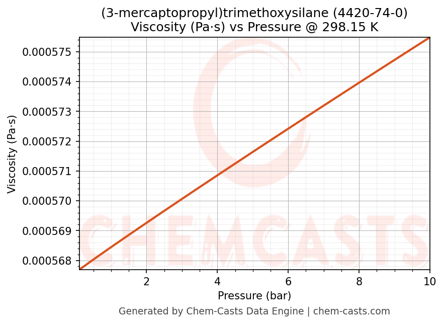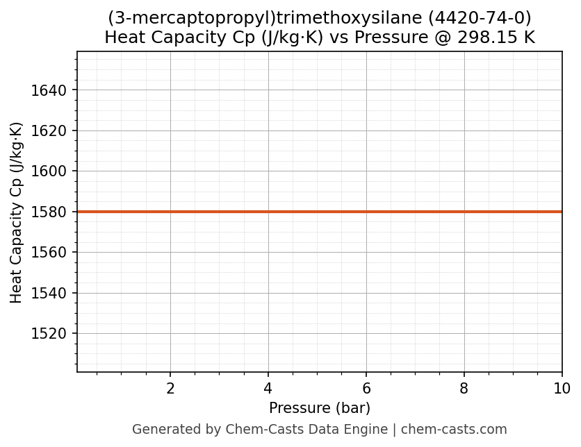 This page presents the pressure-dependent thermodynamic and transport properties of (3-mercaptopropyl)trimethoxysilane (CAS 4420-74-0) calculated at a constant temperature of 298 K (25 °C) over the pressure range 0.10-10 bar.