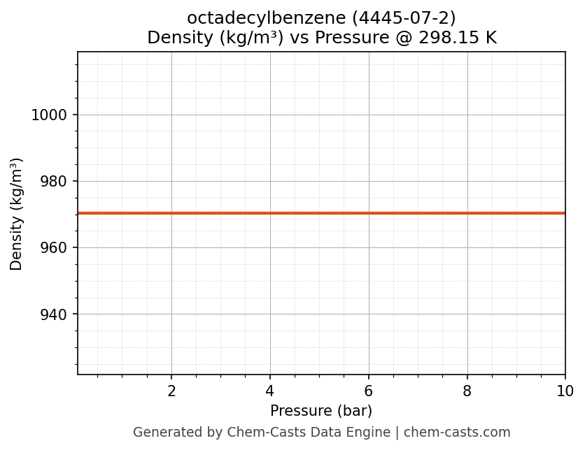 This page presents the pressure-dependent thermodynamic and transport properties of octadecylbenzene (CAS 4445-07-2) calculated at a constant temperature of 298 K (25 °C) over the pressure range 0.10-10 bar.