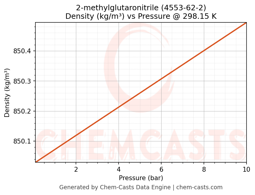 This page presents the pressure-dependent thermodynamic and transport properties of 2-methylglutaronitrile (CAS 4553-62-2) calculated at a constant temperature of 298 K (25 °C) over the pressure range 0.10-10 bar.