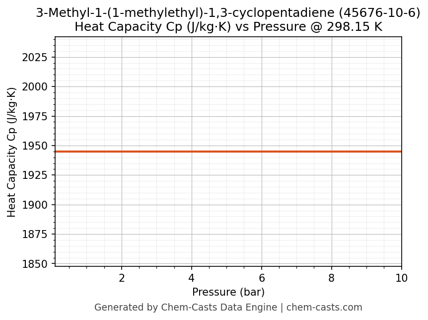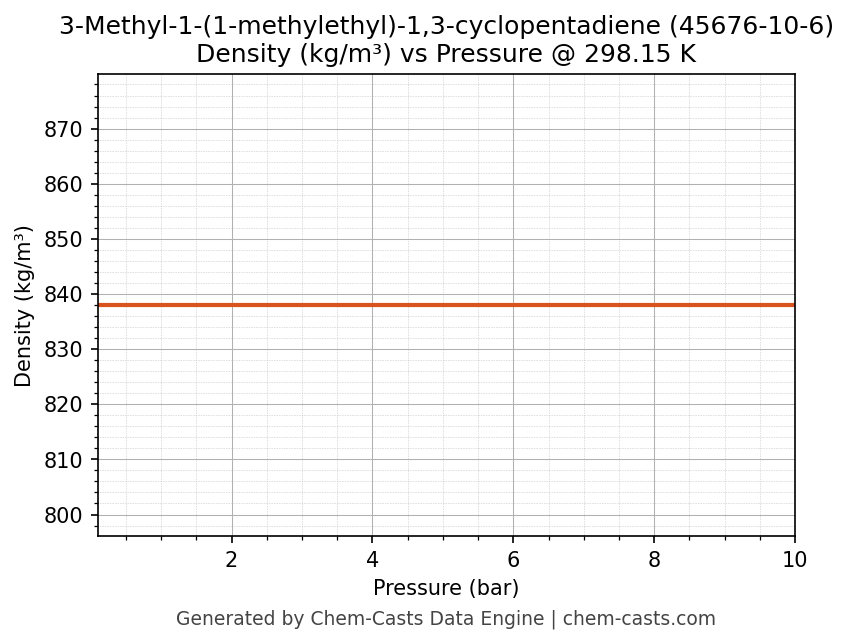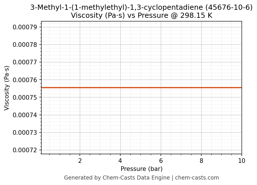 This page presents the pressure-dependent thermodynamic and transport properties of 3-Methyl-1-(1-methylethyl)-1,3-cyclopentadiene (CAS 45676-10-6) calculated at a constant temperature of 298 K (25 °C) over the pressure range 0.10-10 bar.