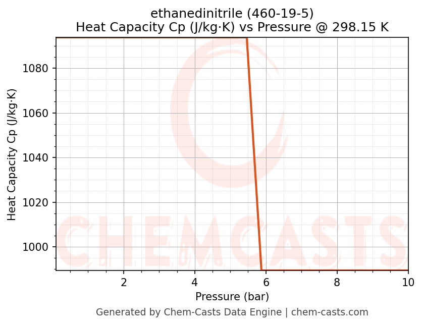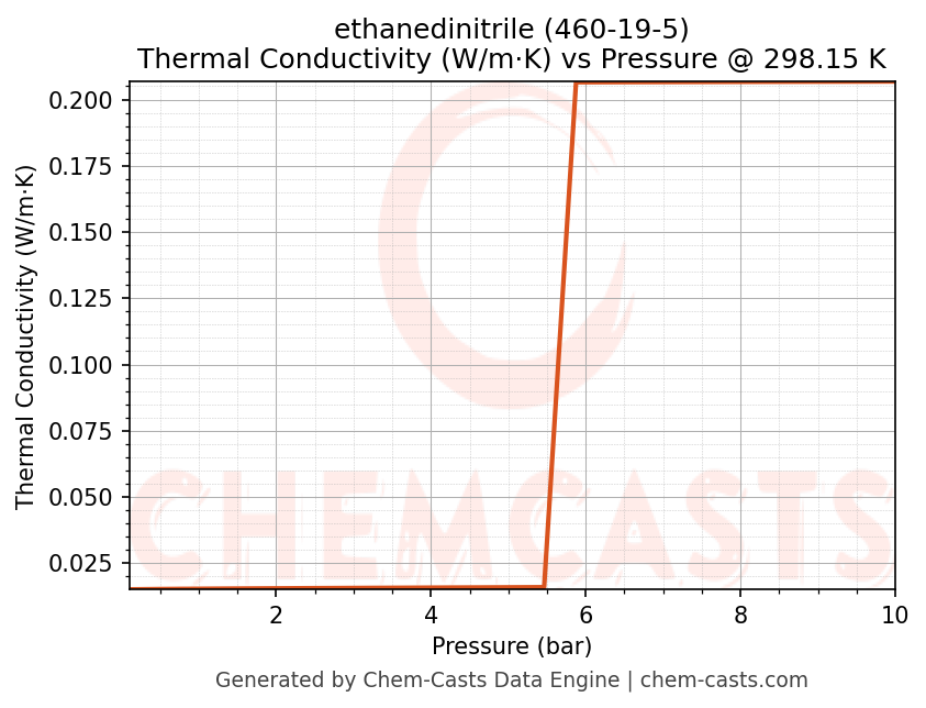 This page presents the pressure-dependent thermodynamic and transport properties of ethanedinitrile (CAS 460-19-5) calculated at a constant temperature of 298 K (25 °C) over the pressure range 0.10-10 bar.