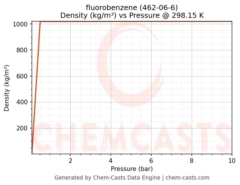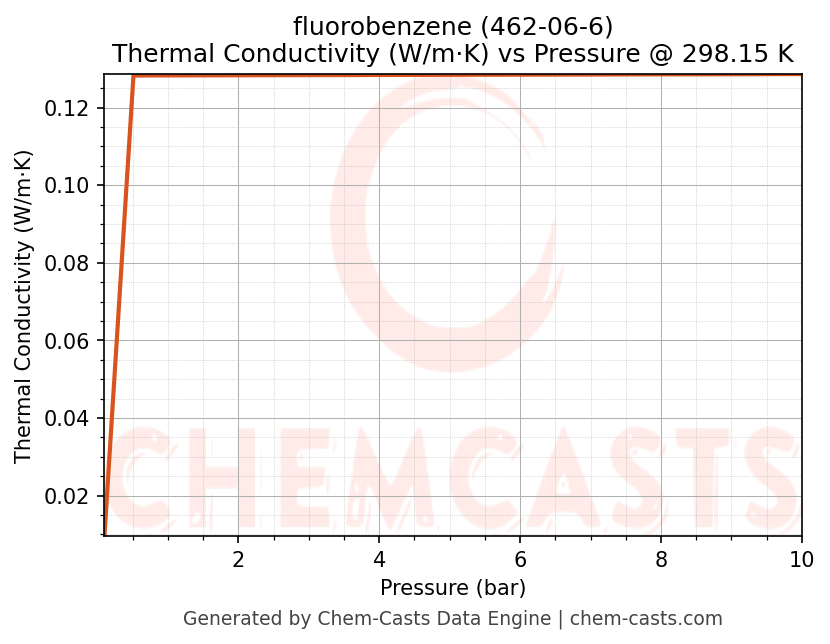 This page presents the pressure-dependent thermodynamic and transport properties of fluorobenzene (CAS 462-06-6) calculated at a constant temperature of 298 K (25 °C) over the pressure range 0.10-10 bar.