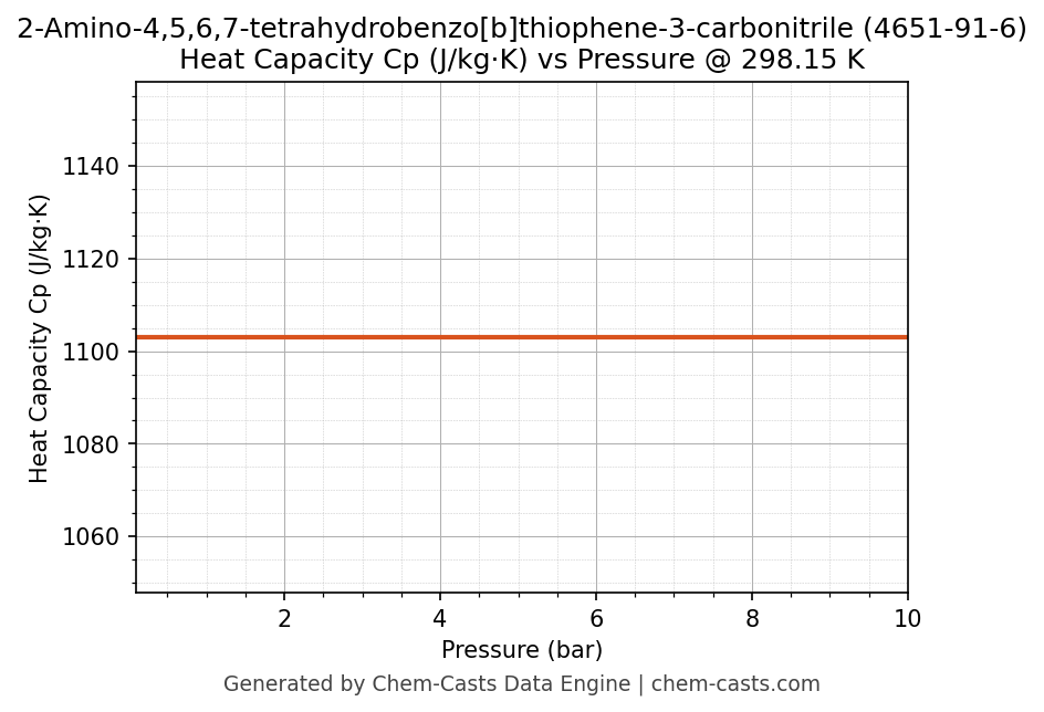 This page presents the pressure-dependent thermodynamic and transport properties of 2-Amino-4,5,6,7-tetrahydrobenzo[b]thiophene-3-carbonitrile (CAS 4651-91-6) calculated at a constant temperature of 298 K (25 °C) over the pressure range 0.10-10 bar.