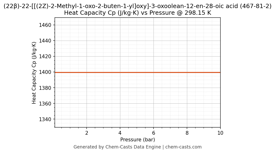 This page presents the pressure-dependent thermodynamic and transport properties of (22β)-22-[[(2Z)-2-Methyl-1-oxo-2-buten-1-yl]oxy]-3-oxoolean-12-en-28-oic acid (CAS 467-81-2) calculated at a constant temperature of 298 K (25 °C) over the pressure range 0.10-10 bar.