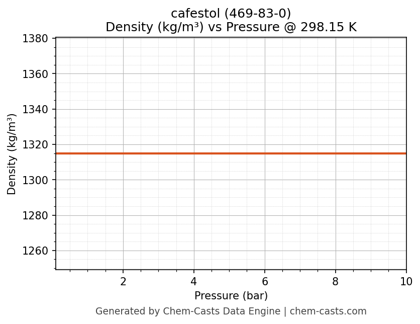 This page presents the pressure-dependent thermodynamic and transport properties of cafestol (CAS 469-83-0) calculated at a constant temperature of 298 K (25 °C) over the pressure range 0.10-10 bar.