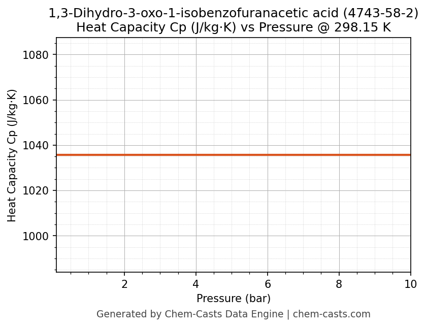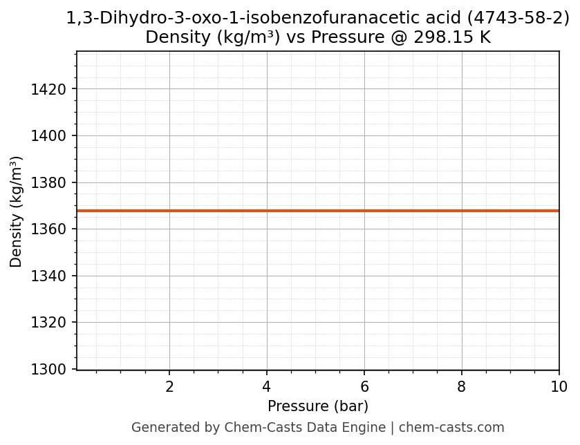 This page presents the pressure-dependent thermodynamic and transport properties of 1,3-Dihydro-3-oxo-1-isobenzofuranacetic acid (CAS 4743-58-2) calculated at a constant temperature of 298 K (25 °C) over the pressure range 0.10-10 bar.