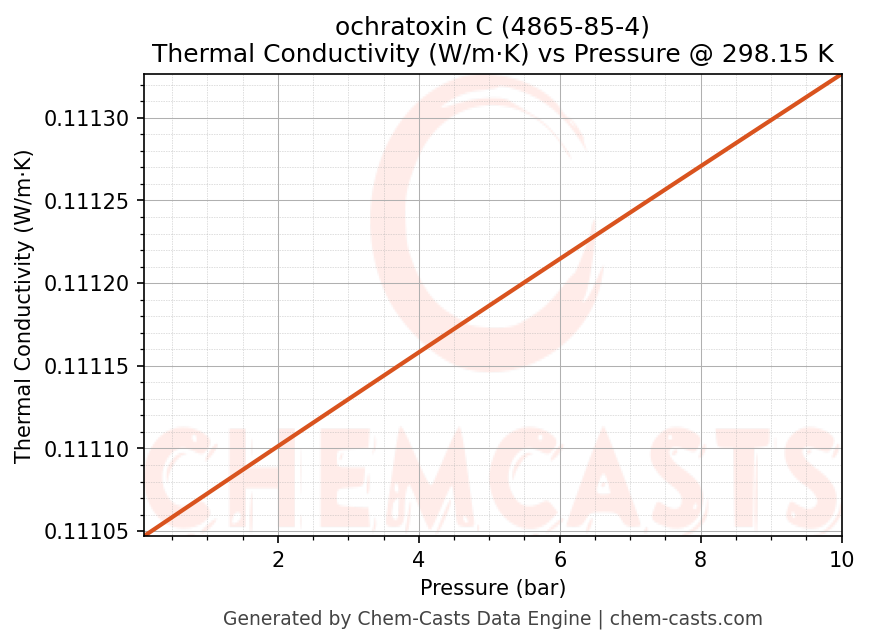 This page presents the pressure-dependent thermodynamic and transport properties of ochratoxin C (CAS 4865-85-4) calculated at a constant temperature of 298 K (25 °C) over the pressure range 0.10-10 bar.