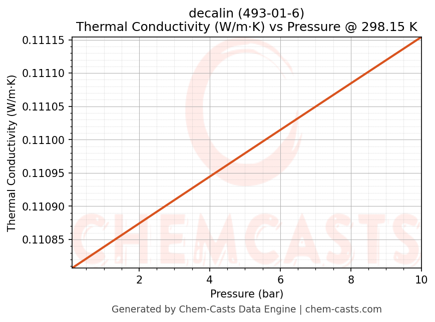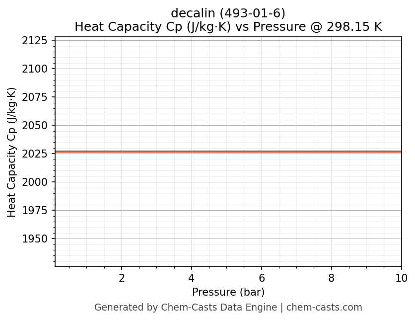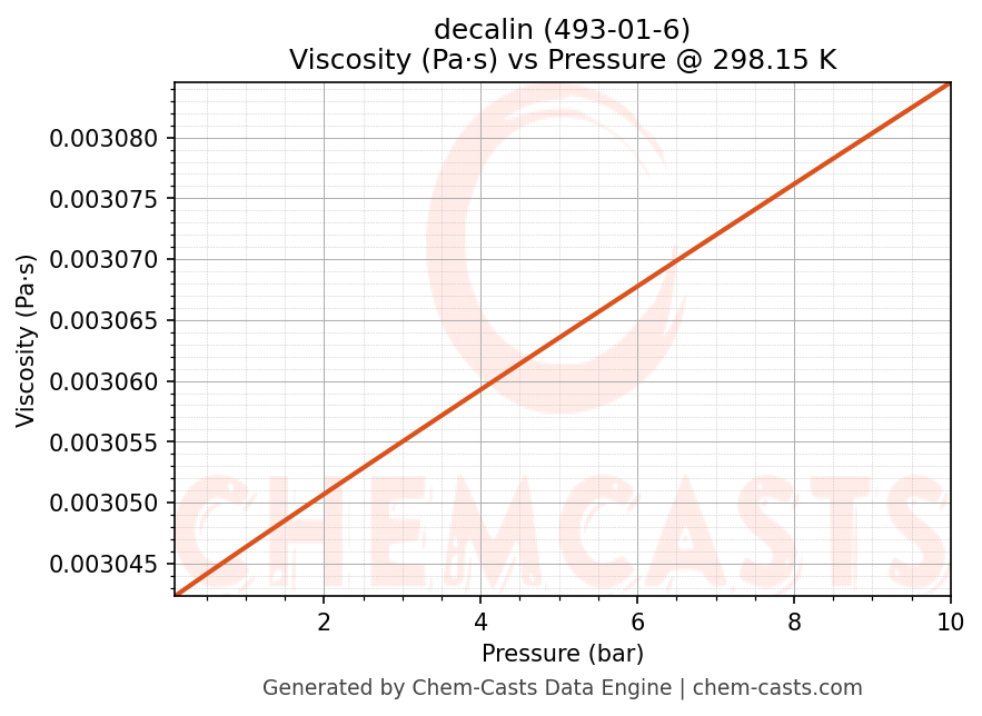 This page presents the pressure-dependent thermodynamic and transport properties of decalin (CAS 493-01-6) calculated at a constant temperature of 298 K (25 °C) over the pressure range 0.10-10 bar.