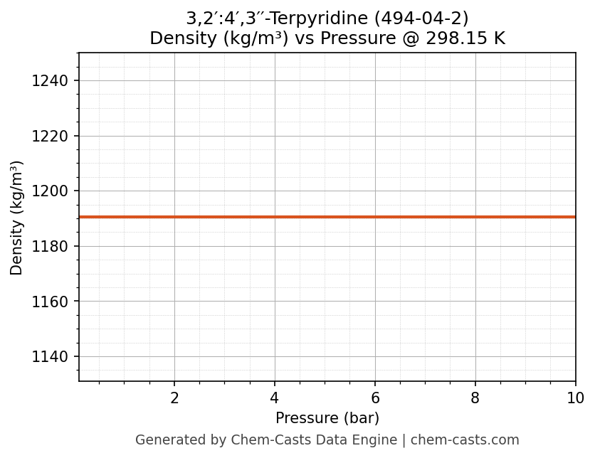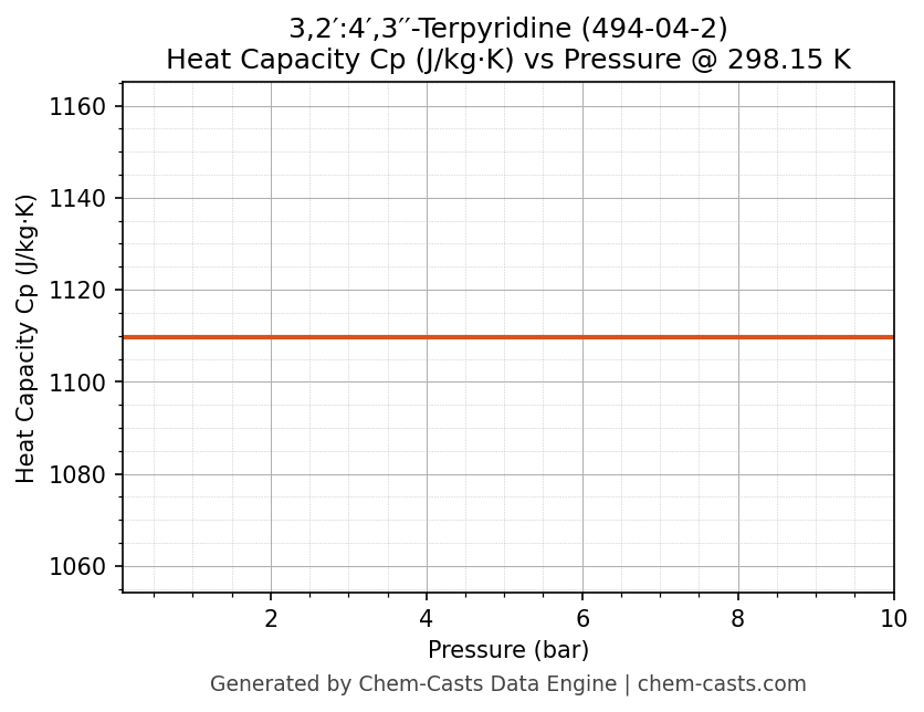 This page presents the pressure-dependent thermodynamic and transport properties of 3,2′:4′,3′′-Terpyridine (CAS 494-04-2) calculated at a constant temperature of 298 K (25 °C) over the pressure range 0.10-10 bar.