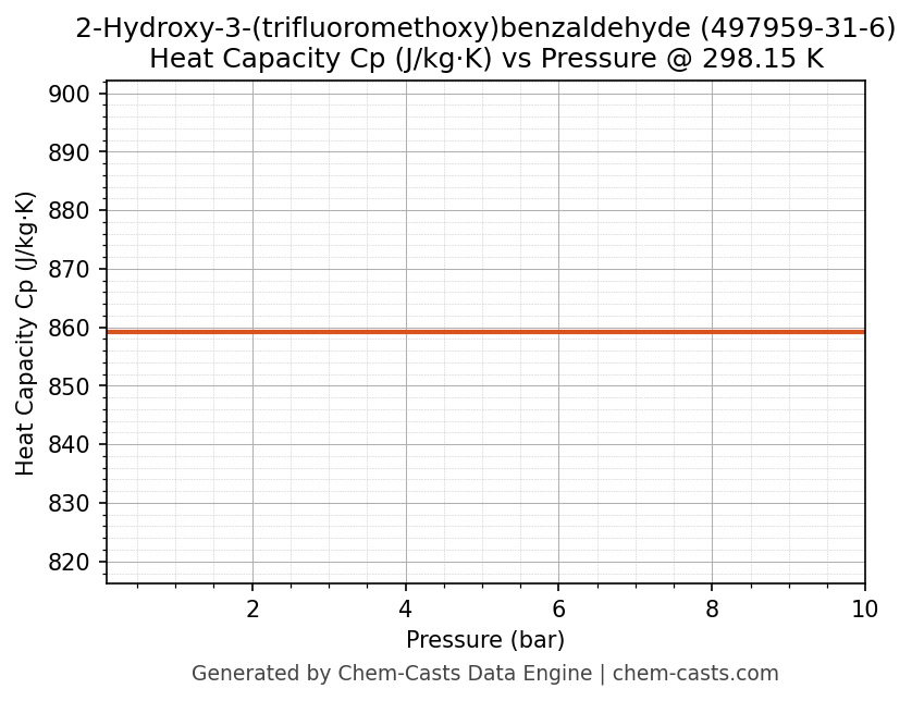 This page presents the pressure-dependent thermodynamic and transport properties of 2-Hydroxy-3-(trifluoromethoxy)benzaldehyde (CAS 497959-31-6) calculated at a constant temperature of 298 K (25 °C) over the pressure range 0.10-10 bar.