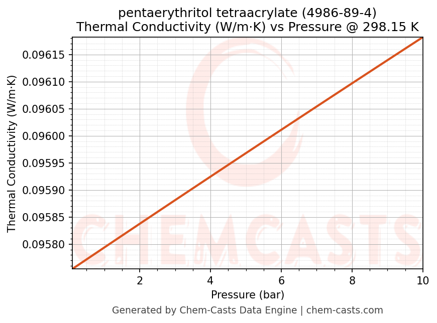 This page presents the pressure-dependent thermodynamic and transport properties of pentaerythritol tetraacrylate (CAS 4986-89-4) calculated at a constant temperature of 298 K (25 °C) over the pressure range 0.10-10 bar.