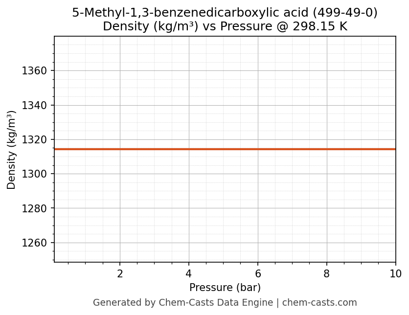 This page presents the pressure-dependent thermodynamic and transport properties of 5-Methyl-1,3-benzenedicarboxylic acid (CAS 499-49-0) calculated at a constant temperature of 298 K (25 °C) over the pressure range 0.10-10 bar.