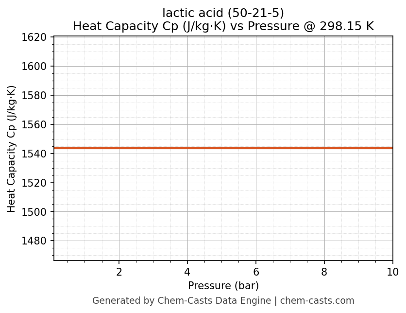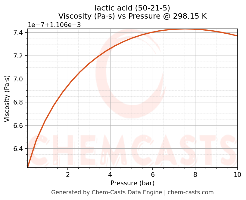 This page presents the pressure-dependent thermodynamic and transport properties of lactic acid (CAS 50-21-5) calculated at a constant temperature of 298 K (25 °C) over the pressure range 0.10-10 bar.