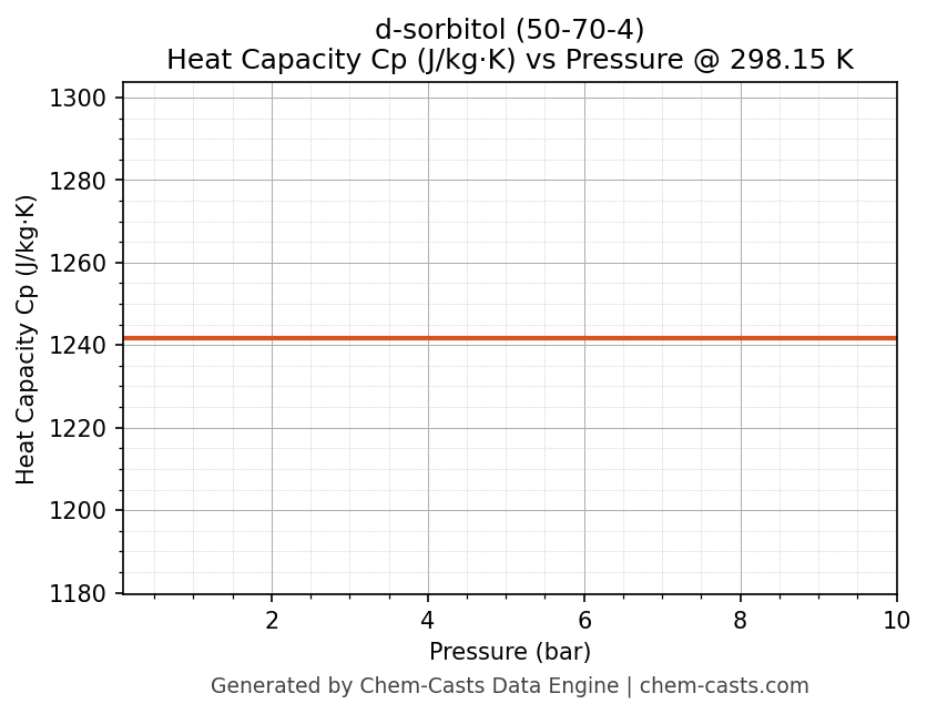 This page presents the pressure-dependent thermodynamic and transport properties of d-sorbitol (CAS 50-70-4) calculated at a constant temperature of 298 K (25 °C) over the pressure range 0.10-10 bar.