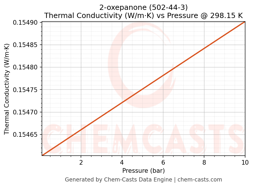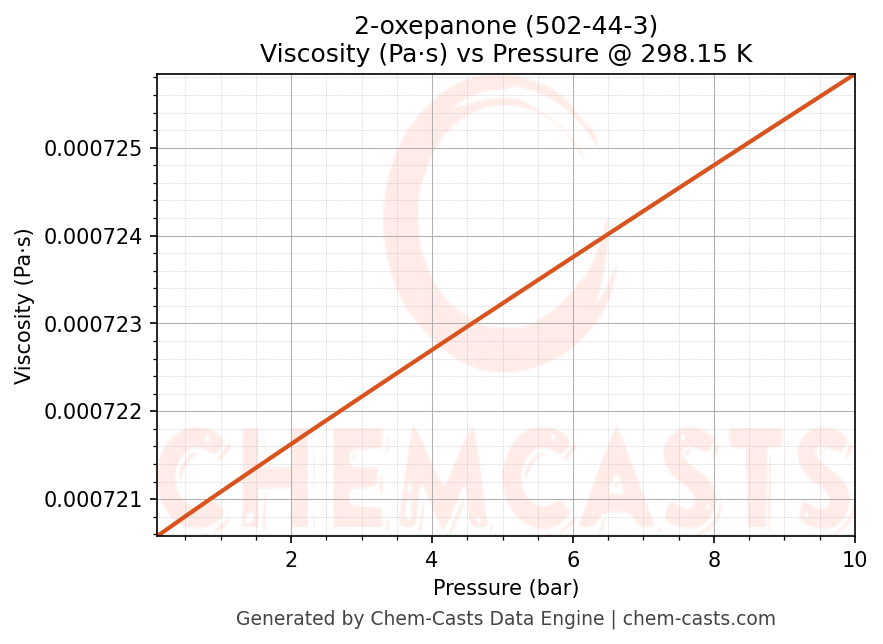 This page presents the pressure-dependent thermodynamic and transport properties of 2-oxepanone (CAS 502-44-3) calculated at a constant temperature of 298 K (25 °C) over the pressure range 0.10-10 bar.