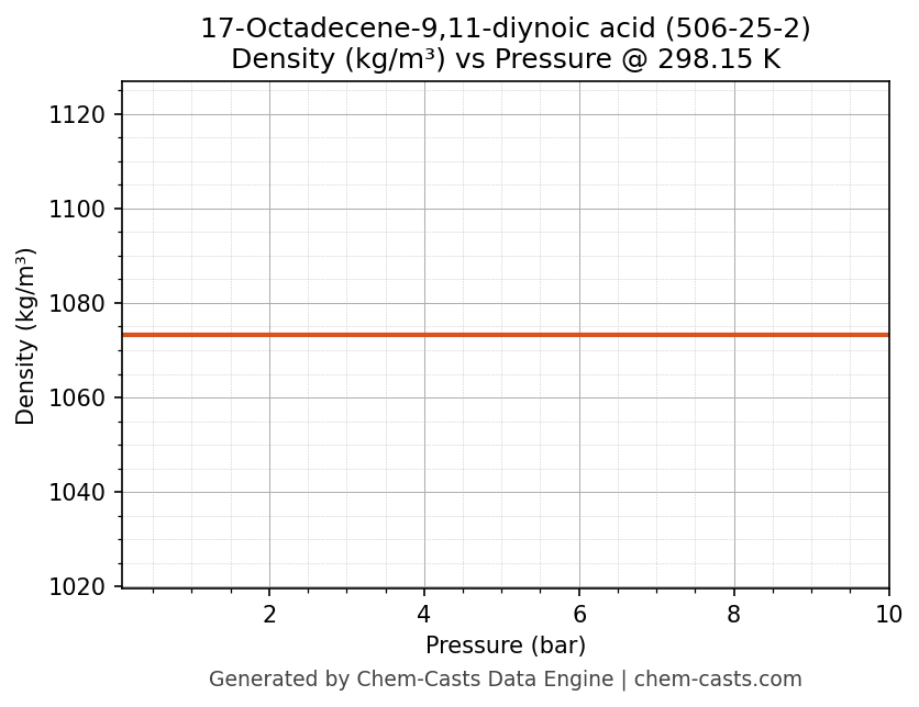 This page presents the pressure-dependent thermodynamic and transport properties of 17-Octadecene-9,11-diynoic acid (CAS 506-25-2) calculated at a constant temperature of 298 K (25 °C) over the pressure range 0.10-10 bar.