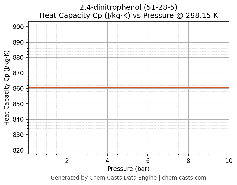 This page presents the pressure-dependent thermodynamic and transport properties of 2,4-dinitrophenol (CAS 51-28-5) calculated at a constant temperature of 298 K (25 °C) over the pressure range 0.10-10 bar.