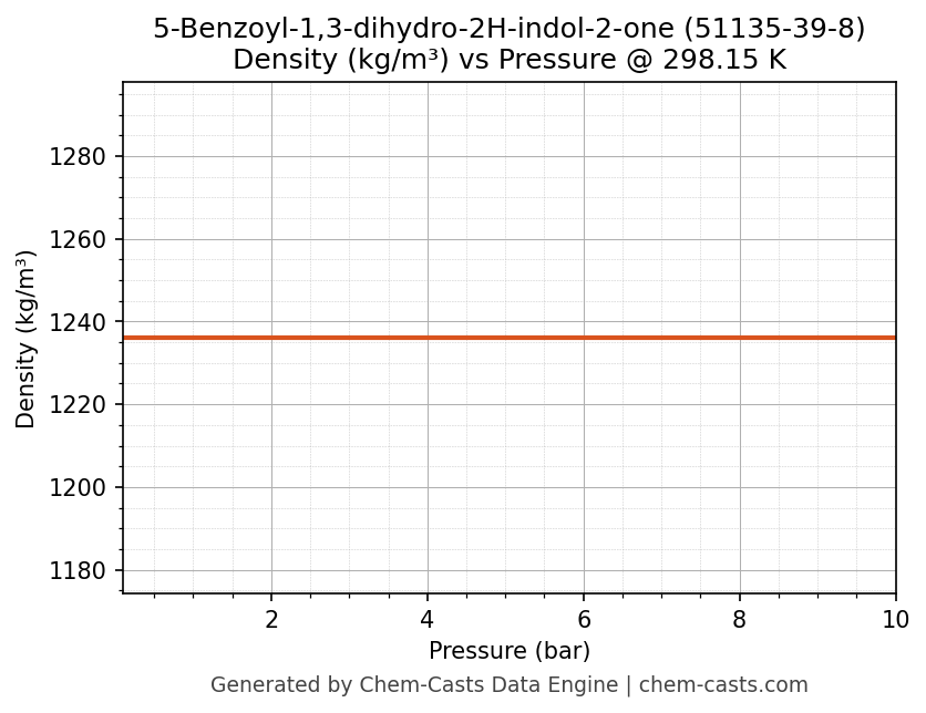 This page presents the pressure-dependent thermodynamic and transport properties of 5-Benzoyl-1,3-dihydro-2H-indol-2-one (CAS 51135-39-8) calculated at a constant temperature of 298 K (25 °C) over the pressure range 0.10-10 bar.