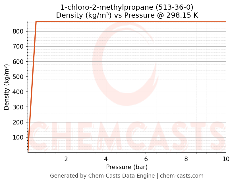 This page presents the pressure-dependent thermodynamic and transport properties of 1-chloro-2-methylpropane (CAS 513-36-0) calculated at a constant temperature of 298 K (25 °C) over the pressure range 0.10-10 bar.