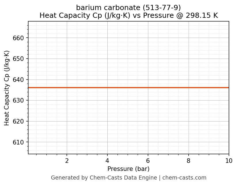 This page presents the pressure-dependent thermodynamic and transport properties of barium carbonate (CAS 513-77-9) calculated at a constant temperature of 298 K (25 °C) over the pressure range 0.10-10 bar.