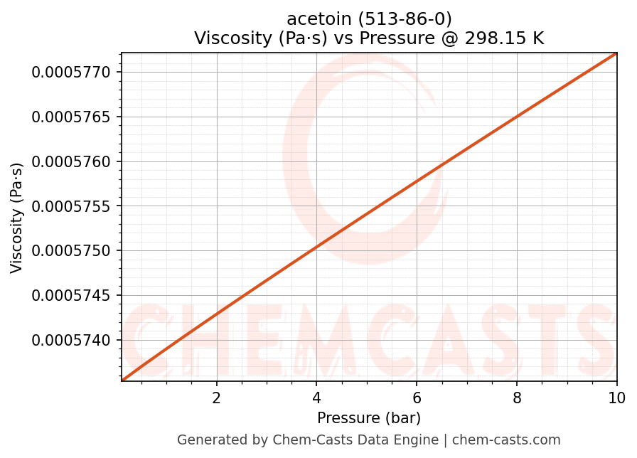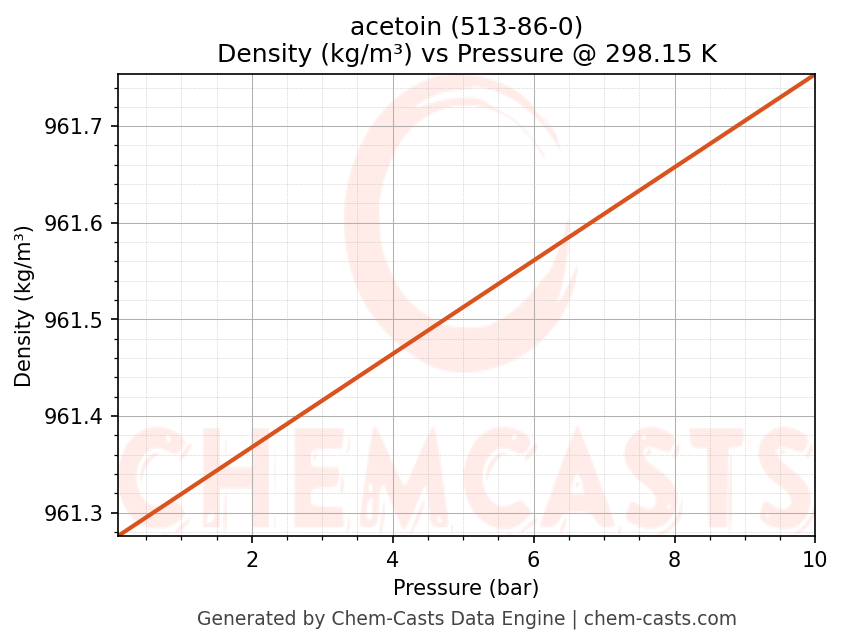 This page presents the pressure-dependent thermodynamic and transport properties of acetoin (CAS 513-86-0) calculated at a constant temperature of 298 K (25 °C) over the pressure range 0.10-10 bar.