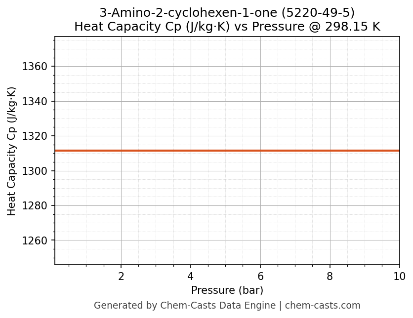 This page presents the pressure-dependent thermodynamic and transport properties of 3-Amino-2-cyclohexen-1-one (CAS 5220-49-5) calculated at a constant temperature of 298 K (25 °C) over the pressure range 0.10-10 bar.