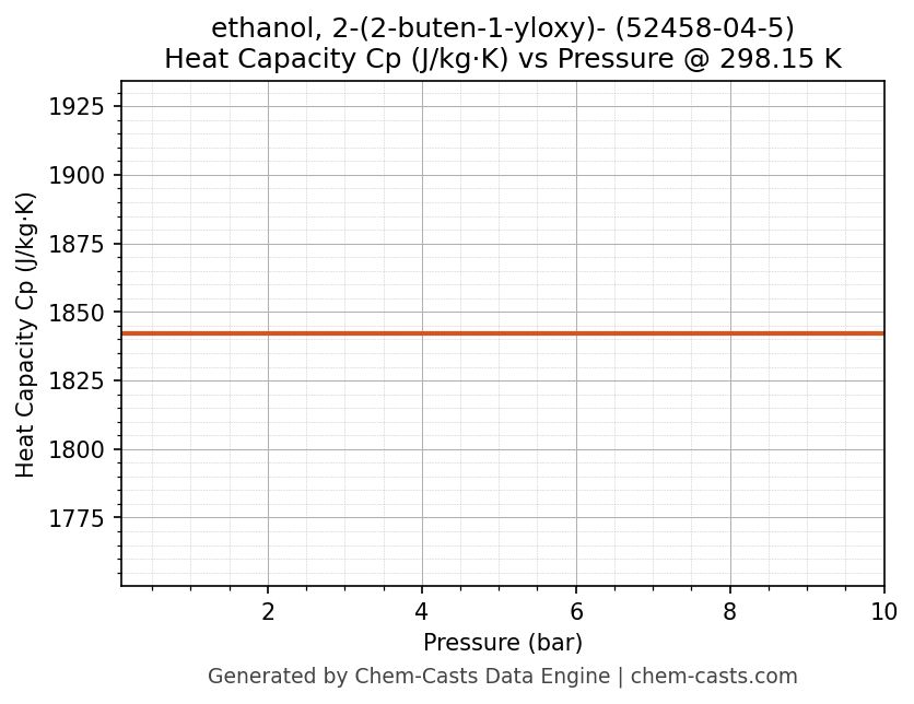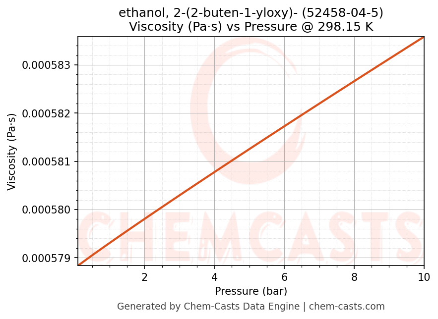 This page presents the pressure-dependent thermodynamic and transport properties of ethanol, 2-(2-buten-1-yloxy)- (CAS 52458-04-5) calculated at a constant temperature of 298 K (25 °C) over the pressure range 0.10-10 bar.