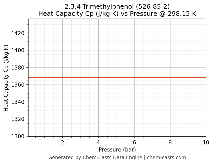 This page presents the pressure-dependent thermodynamic and transport properties of 2,3,4-Trimethylphenol (CAS 526-85-2) calculated at a constant temperature of 298 K (25 °C) over the pressure range 0.10-10 bar.