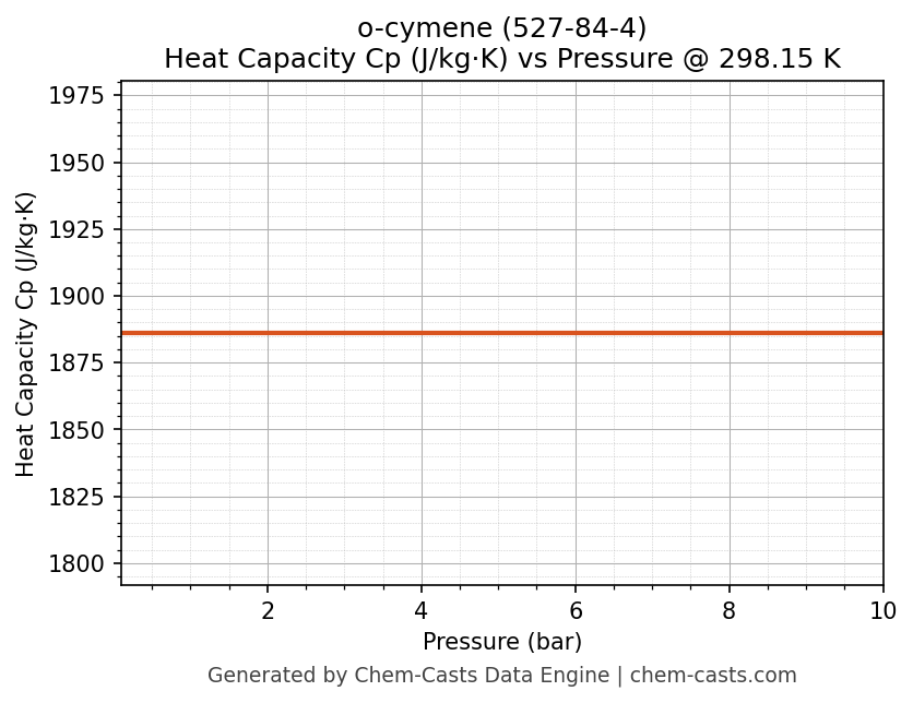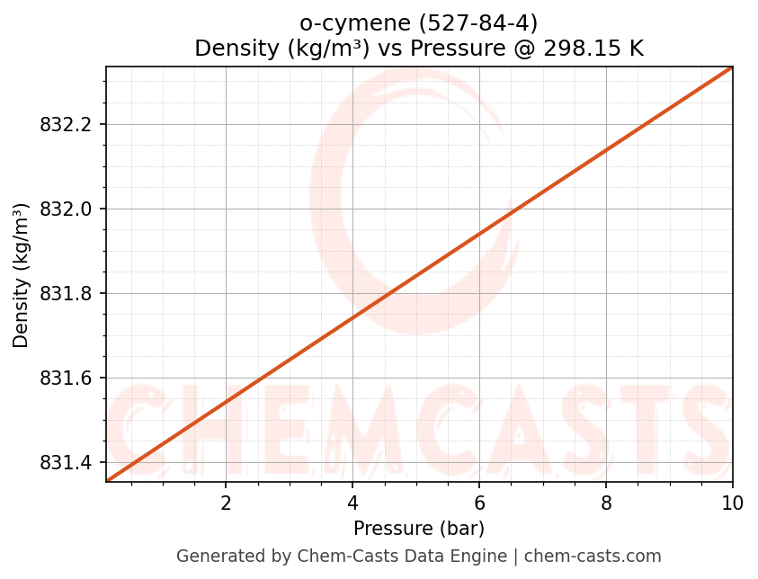 This page presents the pressure-dependent thermodynamic and transport properties of o-cymene (CAS 527-84-4) calculated at a constant temperature of 298 K (25 °C) over the pressure range 0.10-10 bar.