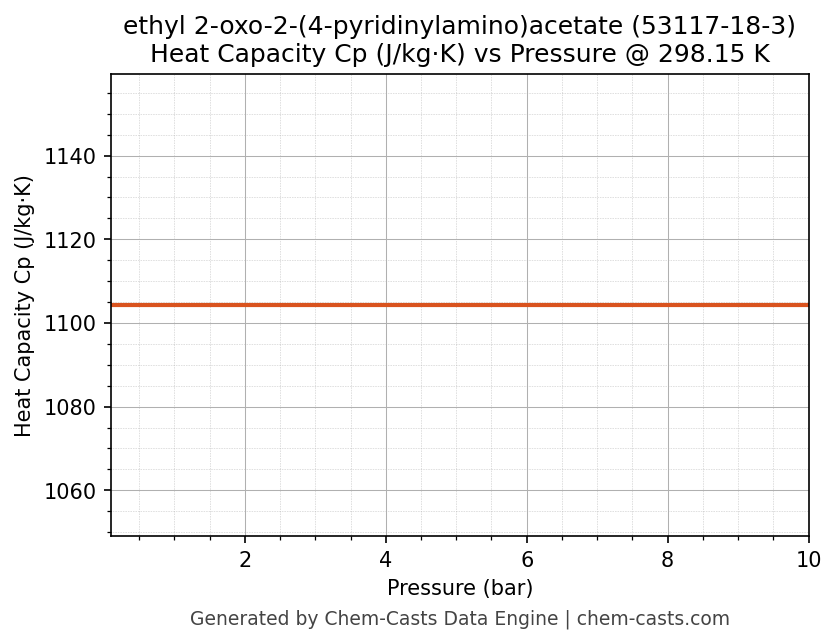 This page presents the pressure-dependent thermodynamic and transport properties of ethyl 2-oxo-2-(4-pyridinylamino)acetate (CAS 53117-18-3) calculated at a constant temperature of 298 K (25 °C) over the pressure range 0.10-10 bar.