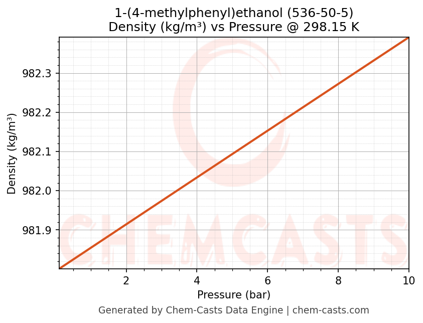 This page presents the pressure-dependent thermodynamic and transport properties of 1-(4-methylphenyl)ethanol (CAS 536-50-5) calculated at a constant temperature of 298 K (25 °C) over the pressure range 0.10-10 bar.