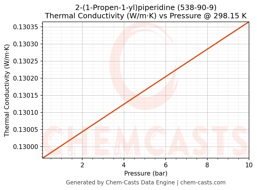 This page presents the pressure-dependent thermodynamic and transport properties of 2-(1-Propen-1-yl)piperidine (CAS 538-90-9) calculated at a constant temperature of 298 K (25 °C) over the pressure range 0.10-10 bar.