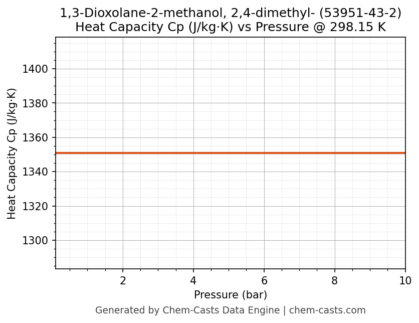 This page presents the pressure-dependent thermodynamic and transport properties of 1,3-Dioxolane-2-methanol, 2,4-dimethyl- (CAS 53951-43-2) calculated at a constant temperature of 298 K (25 °C) over the pressure range 0.10-10 bar.