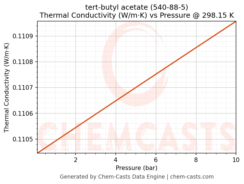 This page presents the pressure-dependent thermodynamic and transport properties of tert-butyl acetate (CAS 540-88-5) calculated at a constant temperature of 298 K (25 °C) over the pressure range 0.10-10 bar.