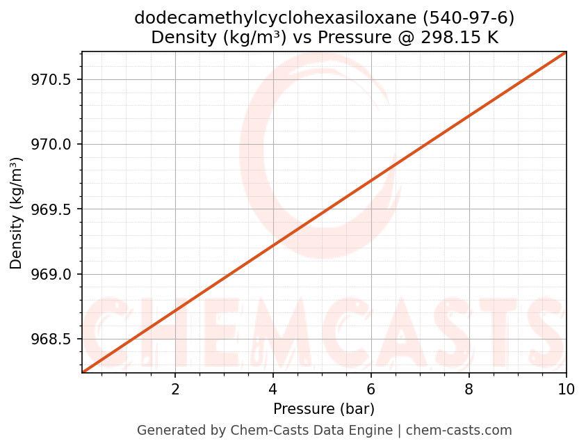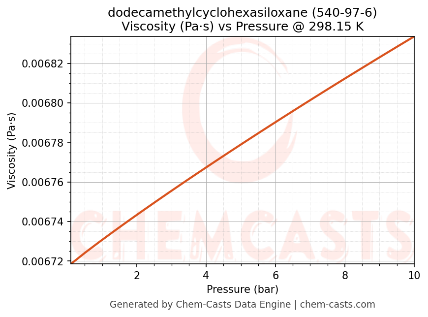 This page presents the pressure-dependent thermodynamic and transport properties of dodecamethylcyclohexasiloxane (CAS 540-97-6) calculated at a constant temperature of 298 K (25 °C) over the pressure range 0.10-10 bar.
