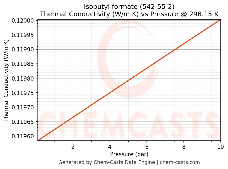 This page presents the pressure-dependent thermodynamic and transport properties of isobutyl formate (CAS 542-55-2) calculated at a constant temperature of 298 K (25 °C) over the pressure range 0.10-10 bar.