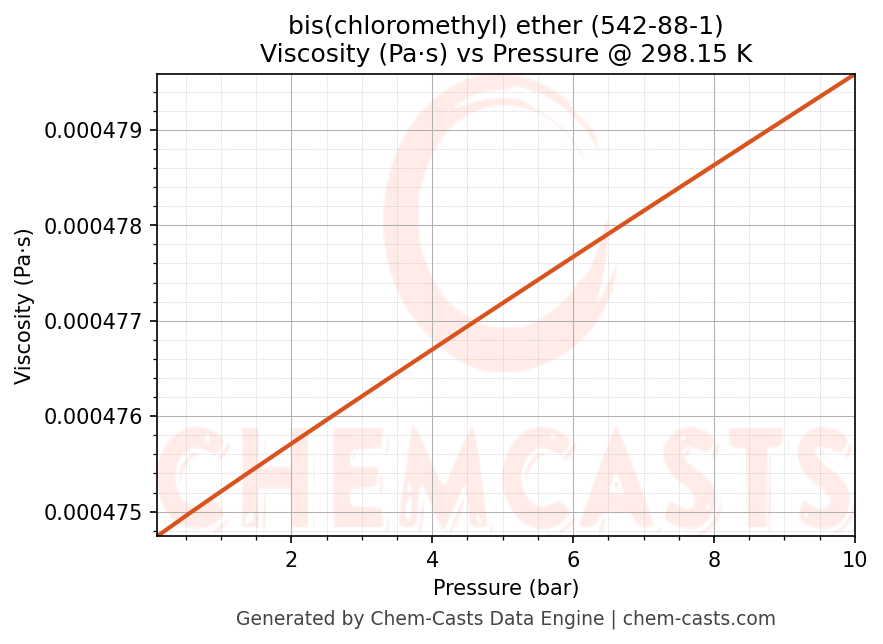 This page presents the pressure-dependent thermodynamic and transport properties of bis(chloromethyl) ether (CAS 542-88-1) calculated at a constant temperature of 298 K (25 °C) over the pressure range 0.10-10 bar.
