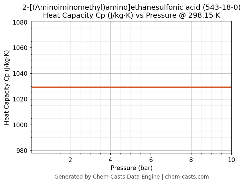 This page presents the pressure-dependent thermodynamic and transport properties of 2-[(Aminoiminomethyl)amino]ethanesulfonic acid (CAS 543-18-0) calculated at a constant temperature of 298 K (25 °C) over the pressure range 0.10-10 bar.