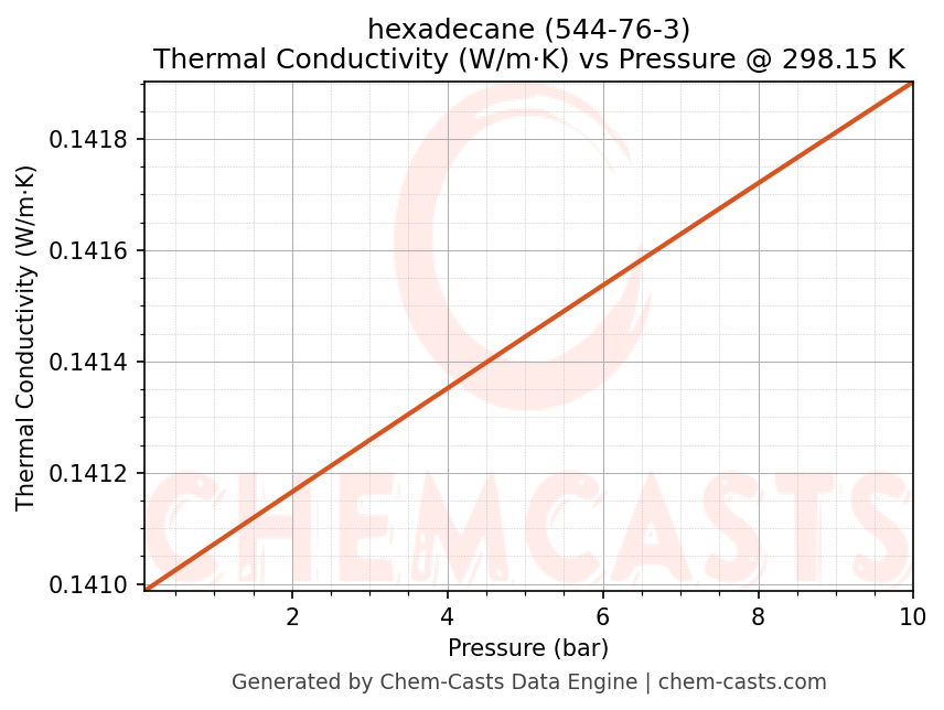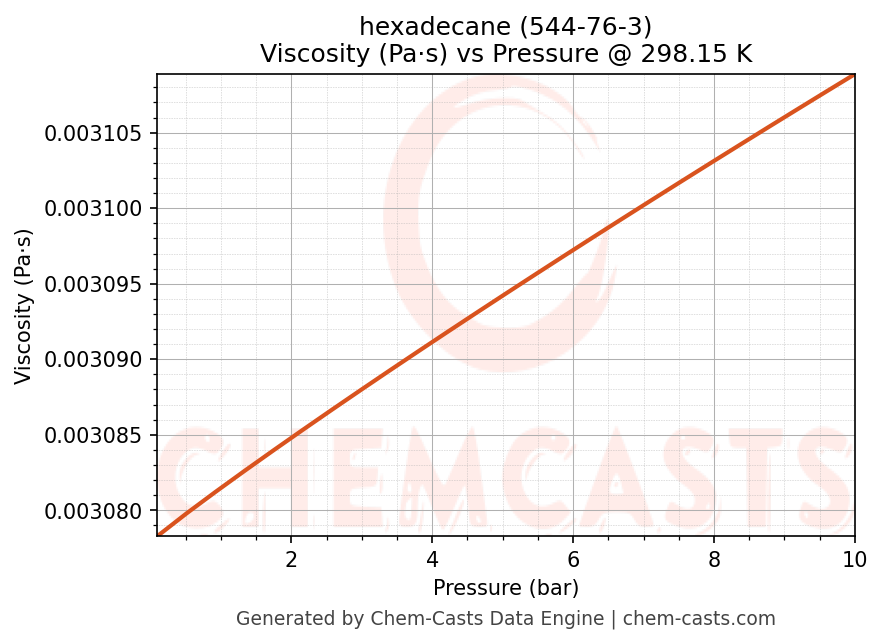 This page presents the pressure-dependent thermodynamic and transport properties of hexadecane (CAS 544-76-3) calculated at a constant temperature of 298 K (25 °C) over the pressure range 0.10-10 bar.