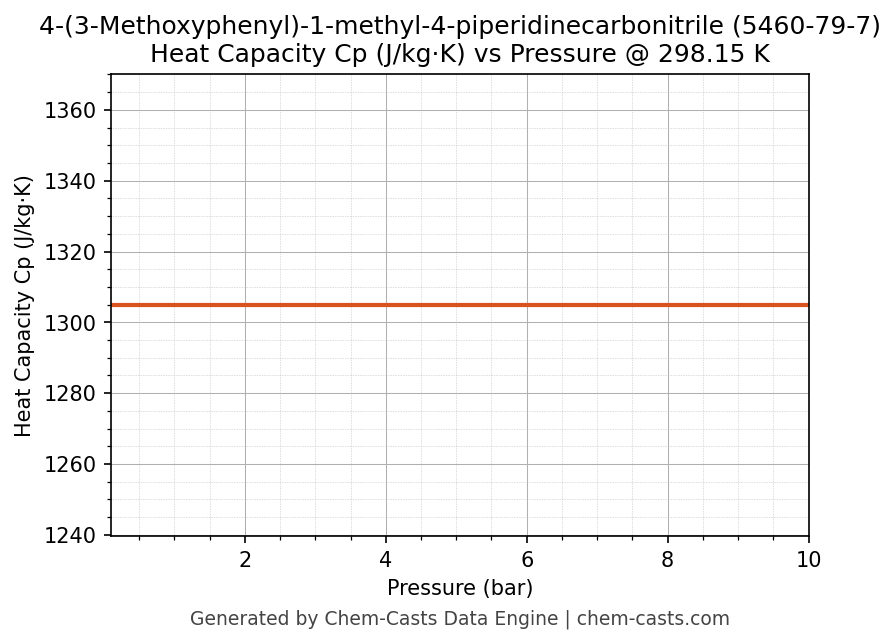 This page presents the pressure-dependent thermodynamic and transport properties of 4-(3-Methoxyphenyl)-1-methyl-4-piperidinecarbonitrile (CAS 5460-79-7) calculated at a constant temperature of 298 K (25 °C) over the pressure range 0.10-10 bar.