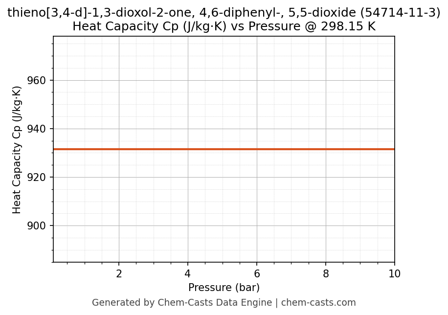 This page presents the pressure-dependent thermodynamic and transport properties of thieno[3,4-d]-1,3-dioxol-2-one, 4,6-diphenyl-, 5,5-dioxide (CAS 54714-11-3) calculated at a constant temperature of 298 K (25 °C) over the pressure range 0.10-10 bar.