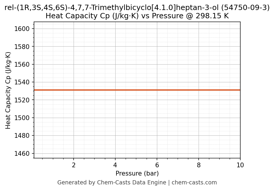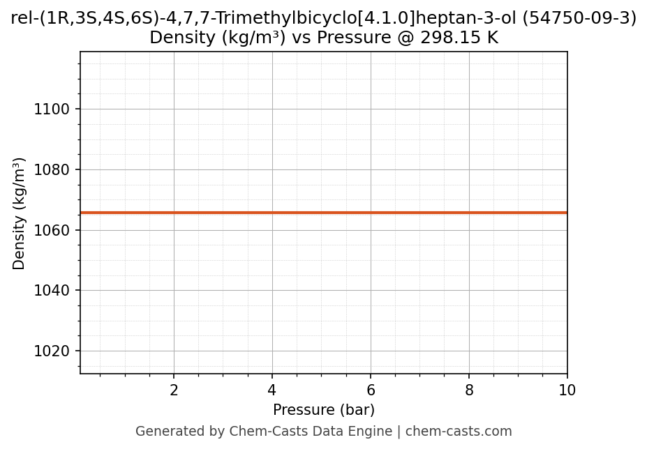 This page presents the pressure-dependent thermodynamic and transport properties of rel-(1R,3S,4S,6S)-4,7,7-Trimethylbicyclo[4.1.0]heptan-3-ol (CAS 54750-09-3) calculated at a constant temperature of 298 K (25 °C) over the pressure range 0.10-10 bar.