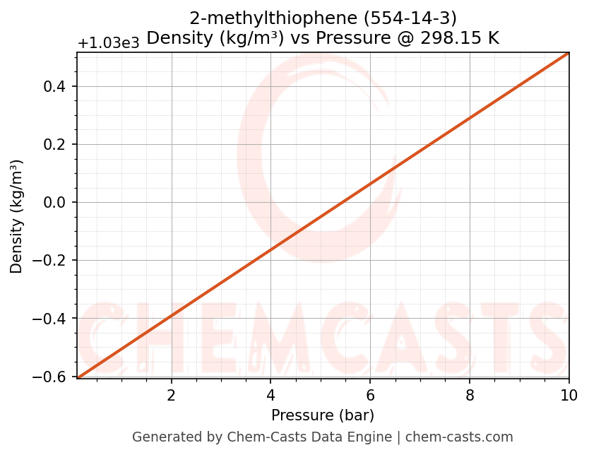 This page presents the pressure-dependent thermodynamic and transport properties of 2-methylthiophene (CAS 554-14-3) calculated at a constant temperature of 298 K (25 °C) over the pressure range 0.10-10 bar.
