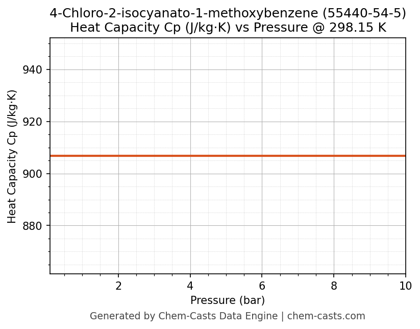 This page presents the pressure-dependent thermodynamic and transport properties of 4-Chloro-2-isocyanato-1-methoxybenzene (CAS 55440-54-5) calculated at a constant temperature of 298 K (25 °C) over the pressure range 0.10-10 bar.