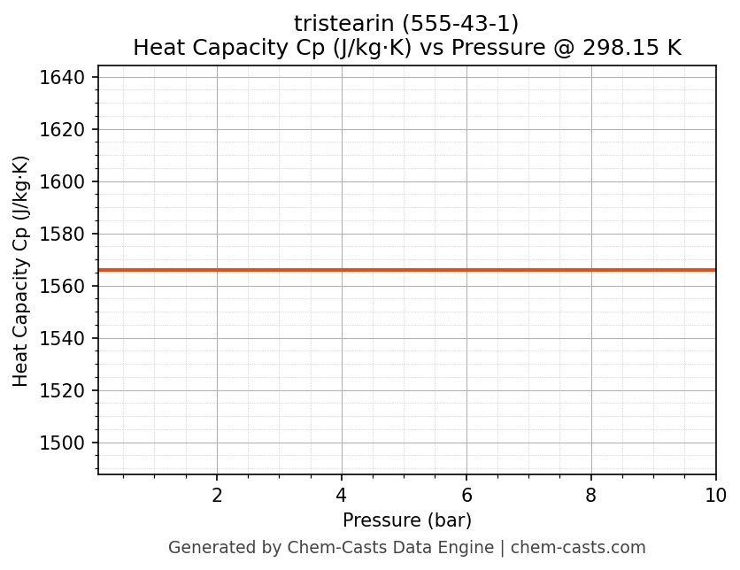 This page presents the pressure-dependent thermodynamic and transport properties of tristearin (CAS 555-43-1) calculated at a constant temperature of 298 K (25 °C) over the pressure range 0.10-10 bar.