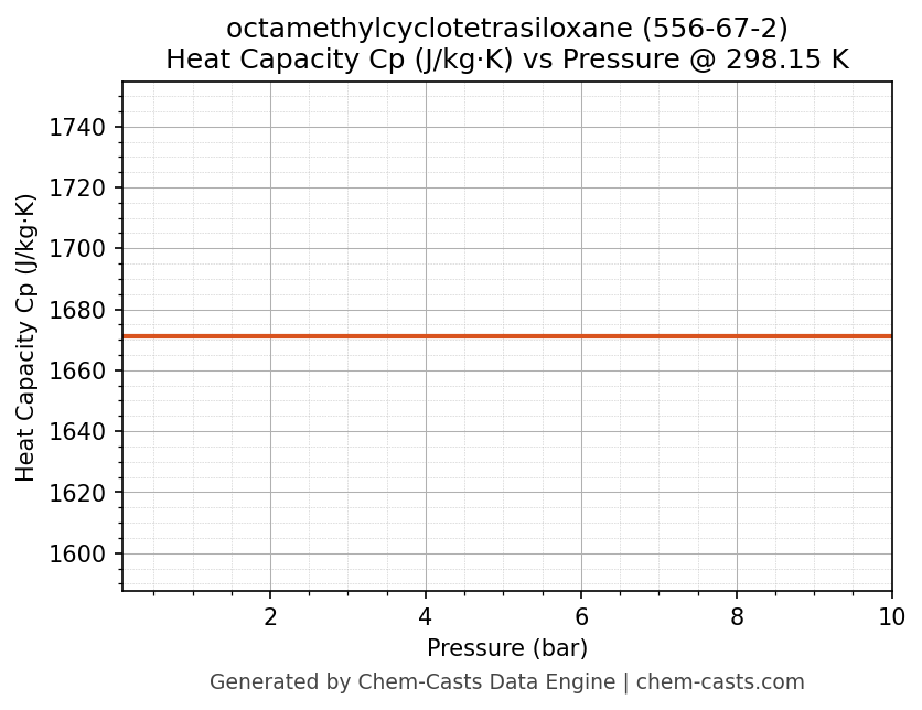 This page presents the pressure-dependent thermodynamic and transport properties of octamethylcyclotetrasiloxane (CAS 556-67-2) calculated at a constant temperature of 298 K (25 °C) over the pressure range 0.10-10 bar.