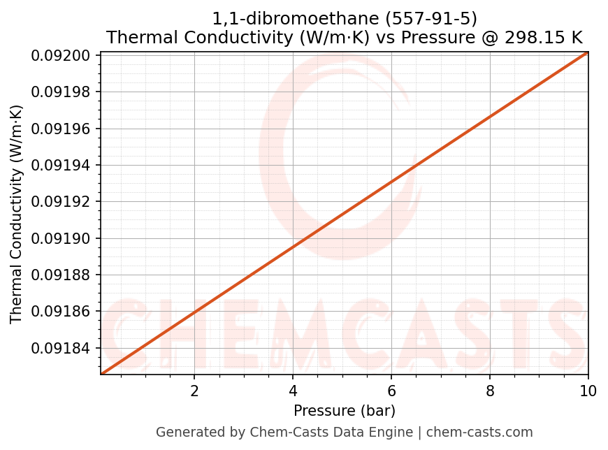 This page presents the pressure-dependent thermodynamic and transport properties of 1,1-dibromoethane (CAS 557-91-5) calculated at a constant temperature of 298 K (25 °C) over the pressure range 0.10-10 bar.